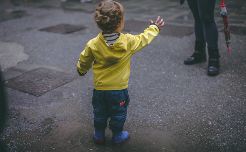 Niño con capucha amarilla extiende su mano a su madre