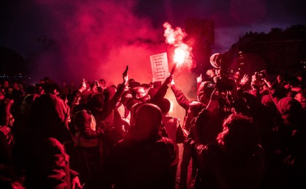 Hombre sostiene llamarada dentro de una multitud.