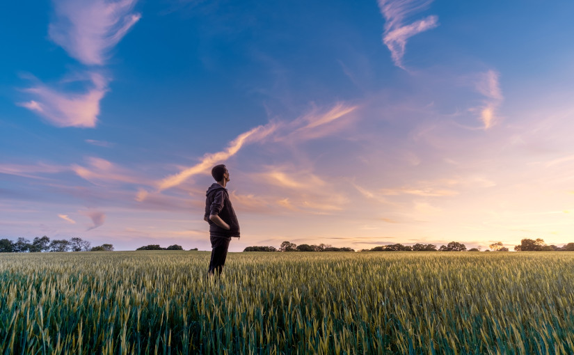 Hombre sobre hierba mirando al cielo.