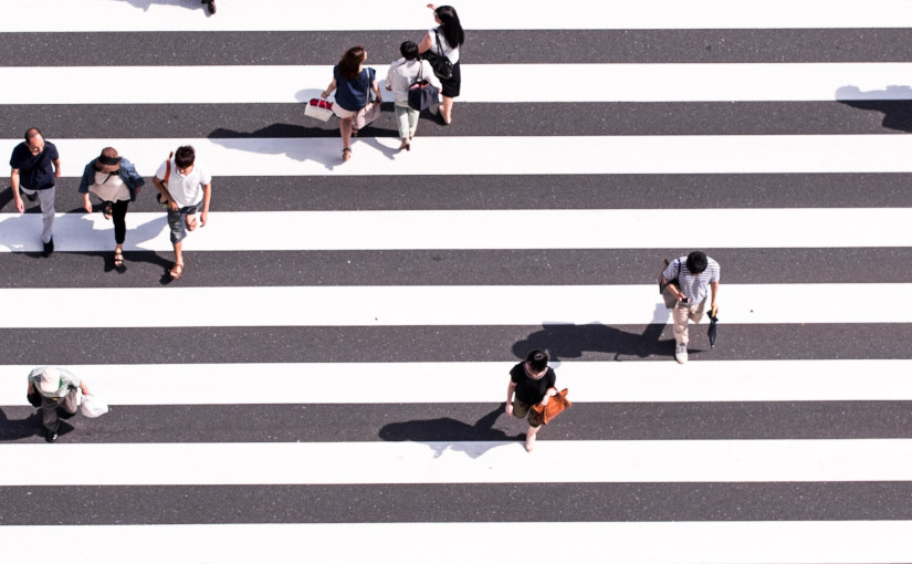 Vista aérea de personas caminando en la calle.