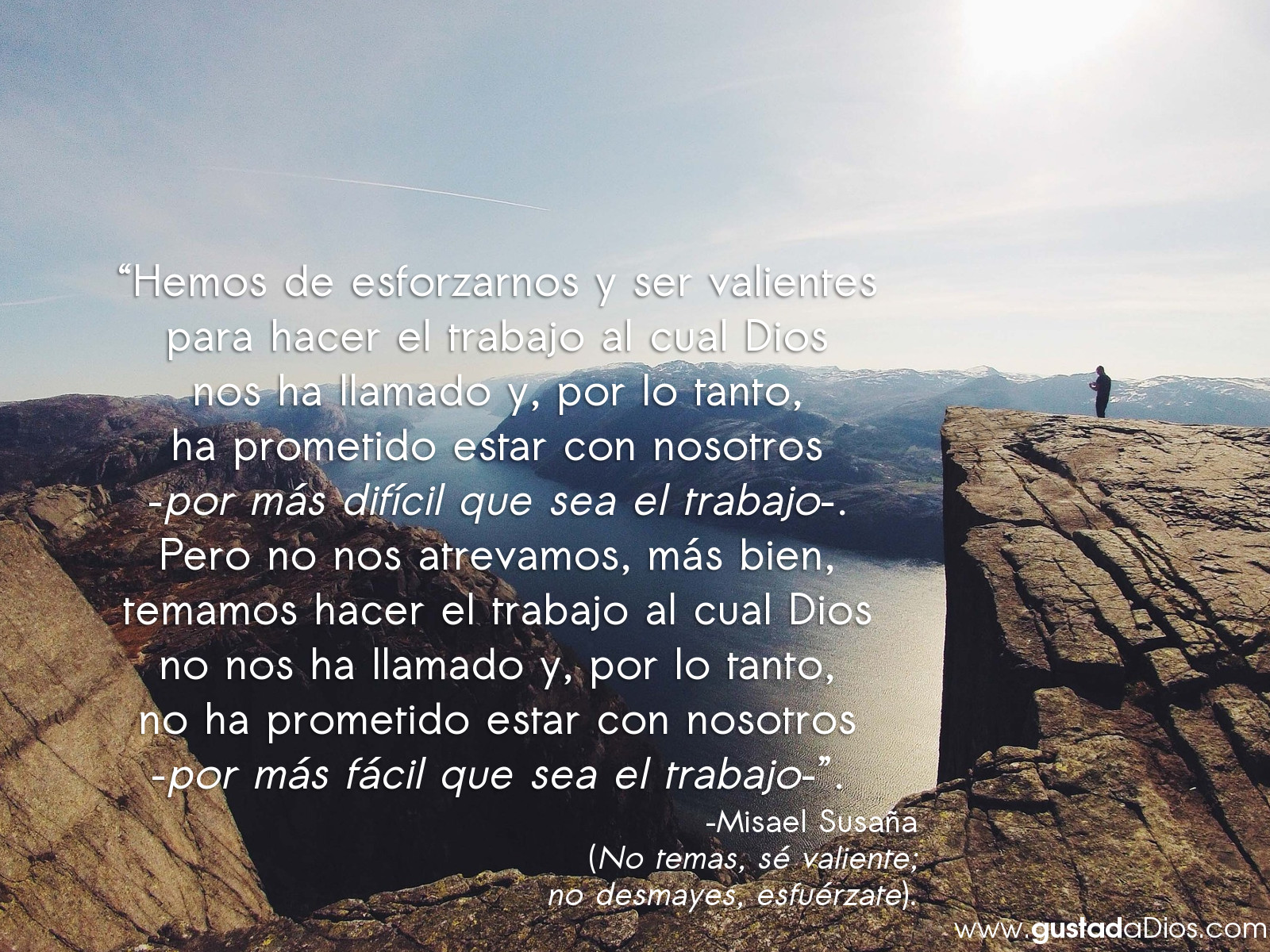 “Hemos de esforzarnos y ser valientes para hacer el trabajo al cual Dios nos ha llamado y, por lo tanto, ha prometido estar con nosotros –por más difícil que sea el trabajo–. Pero no nos atrevamos, más bien, temamos hacer el trabajo al cual Dios no nos ha llamado y, por lo tanto, no ha prometido estar con nosotros –por más fácil que sea el trabajo–” –Misael Susaña (No temas, sé valiente; no desmayes, esfuérzate).